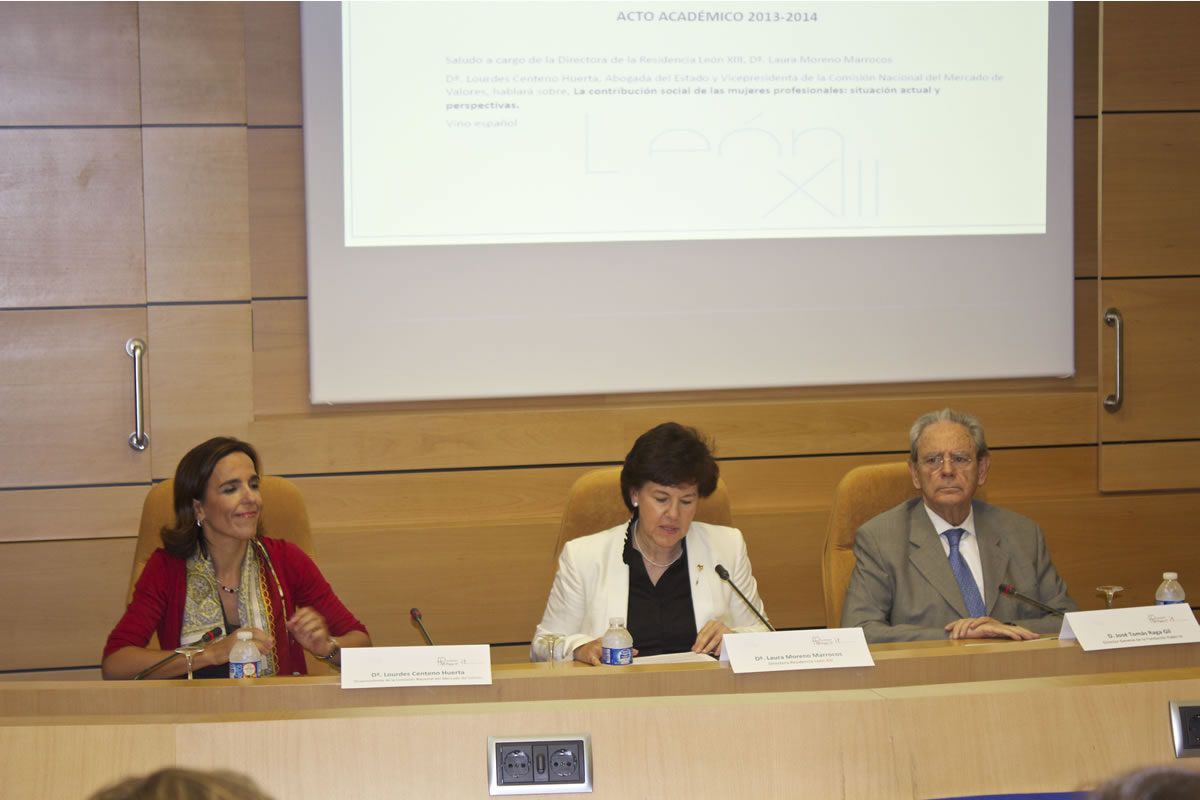 El saludo inicial estuvo a cargo de la Directora de la Residencia León XIII, Dª. Laura Moreno Marrocos, quien presidió el acto acompañada de Don José Tomás Raga, director general de la Fundación PabloVI y de Dª. Lourdes Centeno Huerta, Abogada del Estado y Vicepresidenta de la Comisión Nacional del Mercado de Valores, quien tuvo una intervención sobre «La contribución social de las mujeres profesionales: situación actual y perspectivas.»